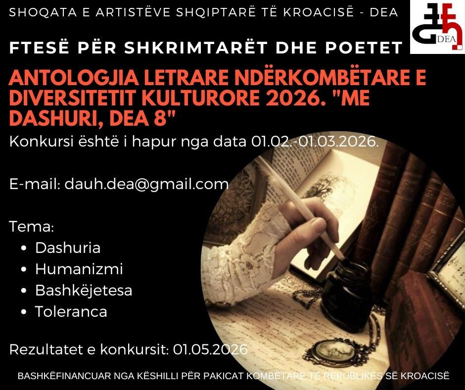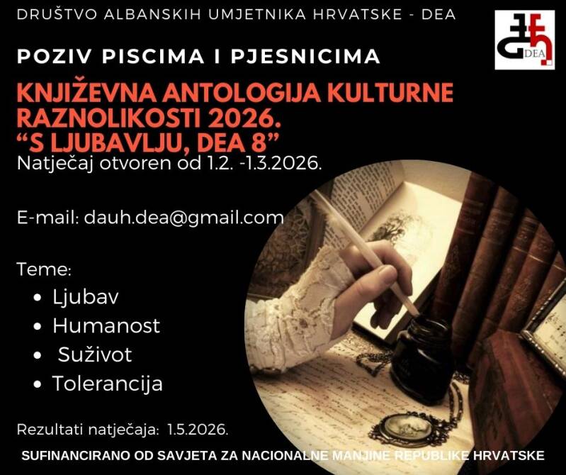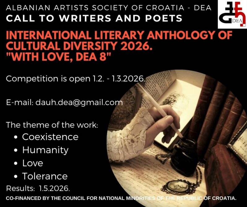 Društvo albanskih umjetnika Hrvatske – DEA poziva pisce i pjesnike iz Hrvatske, Europe i svijeta da pošalju do 3 autorska rada.